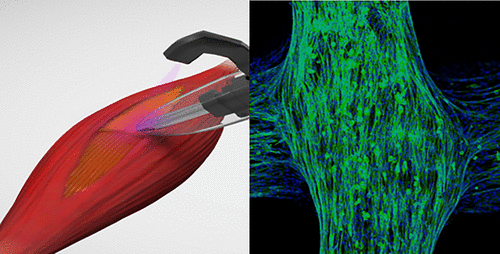首先,科學(xué)家將基于明膠的水凝膠直接沉積到肌肉內(nèi)不需要的間隙中。集成的紫外線可使凝膠固化成由微小的類肌肉纖維組成的生物支架,該生物支架易于粘附在相鄰的肌肉組織上,無需縫合。肌肉細(xì)胞然后進(jìn)入支架。在實(shí)驗(yàn)室測試中,該設(shè)備被證明可有效治療小鼠的體積性肌肉損傷。