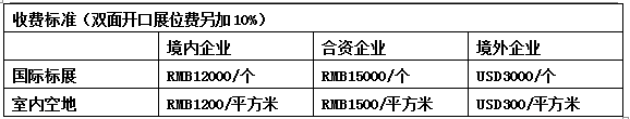 1  3mx3m國際標(biāo)準(zhǔn)展位包括三面圍板、楣板、一桌兩椅、兩盞射燈、220v電源插座(其他展具及服務(wù)產(chǎn)生的費用由客商自理)