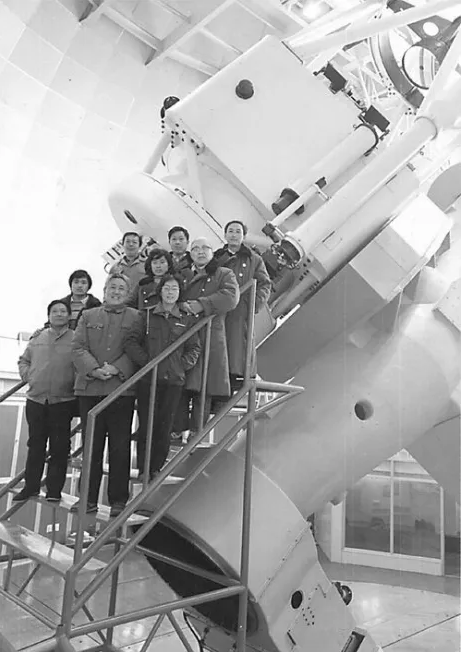 1989年2.16米望遠(yuǎn)鏡運(yùn)送到北京天文臺(tái)興隆站后潘君驊(中排右一)與研究人員在圓頂室內(nèi)合影(圖片來源于清華大學(xué)校史館)