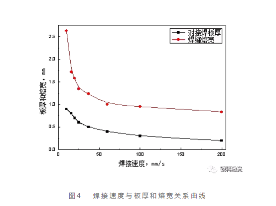 圖4為半導激光焊接薄板不銹鋼試驗焊接速度與板厚和熔寬的關系曲線,可以看出,焊接速度隨著板厚減小而快速增加。