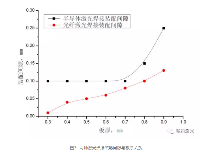 從圖中可以看出在不同板厚下半導體激光焊接裝配間隙均大于光纖激光焊接裝配間隙,隨著板厚的增加裝配間隙相差越大。
