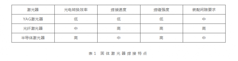 固體激光器中YAG激光器、光纖激光器和半導體激光器在焊接薄板不銹鋼中各有優(yōu)勢,具體特點如表1所示。
