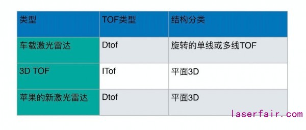 下面本文分析蘋果新的激光雷達(dá)和之前的手機(jī)3D TOF還有車載雷達(dá)有什么區(qū)別,有什么技術(shù)突破.首先三者的結(jié)構(gòu)實(shí)現(xiàn)和算法原理的區(qū)別可以參考下表: