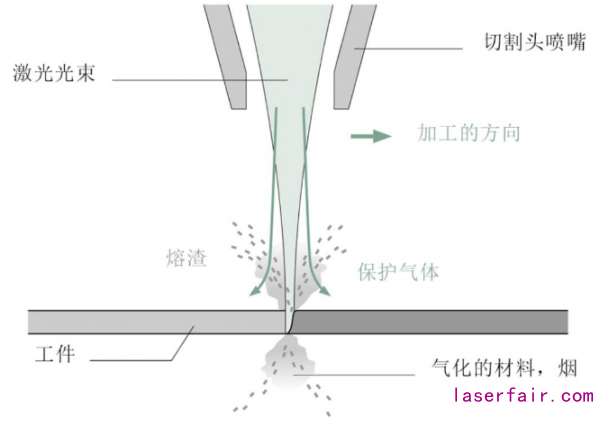 圖1 激光束熔化工件,切割氣吹走切口中的熔融材料和熔渣