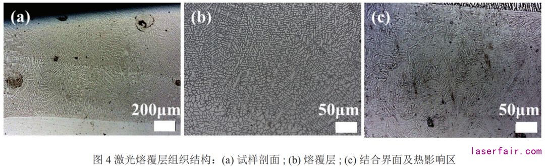 圖 4 為熔覆層的組織結(jié)構(gòu),由圖 4(a)、(b) 可見,熔覆層無裂紋、氣孔等缺陷,組織呈細(xì)小致密的枝晶狀。且結(jié)合界面清晰平滑,可見白亮窄帶,說明熔覆層與基體之間為冶金結(jié)合。在大激光功率下,基體和熔覆材料吸收的有效能量密度大,熔池停留時(shí)間短,驟熱驟冷,故激光熔覆層的組織較為細(xì)小、均勻,主要組織均為馬氏體和少量殘余奧氏體。如圖 (c) 所示,結(jié)合界面附近的基體組織的細(xì)晶區(qū),該區(qū)域冷卻后形成較為粗大的回火馬氏體。