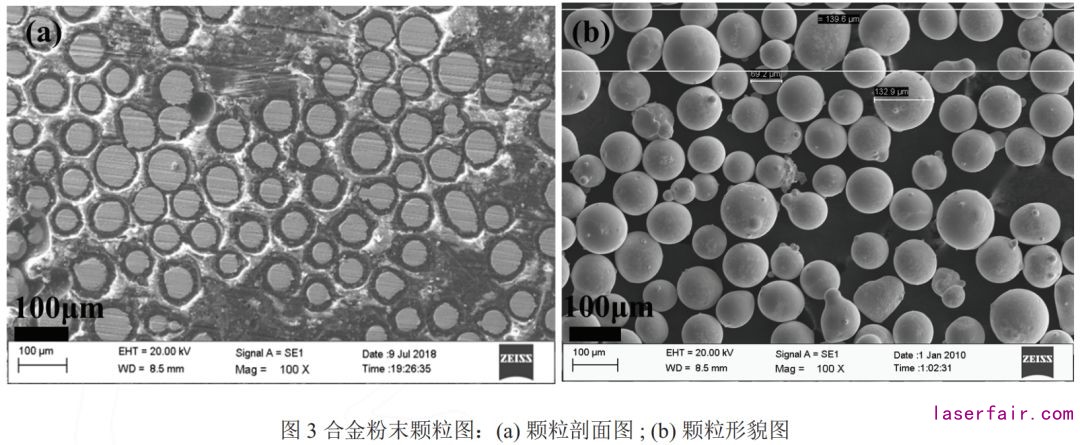 要嚴(yán)格篩選合金粉末。據(jù)悉,合金粉末制備的關(guān)鍵在于顆粒度的均勻性,如若顆粒度不均勻,大、小顆粒度之間即存在相互脫碳、應(yīng)力分布不均等情況,極易導(dǎo)致熔覆開裂等缺陷的形成,且嚴(yán)重 影響送粉、熔凝過程。如圖 3 為本實(shí)驗(yàn)選用的合 金粉末粒度情況,可見粉末顆粒呈圓形分布,球型顆粒度較為均勻光滑,球形度較高,粒度直徑約為 63.6μm ~139.6μm。粒度均勻且球形度高的 合金粉末具備高流動(dòng)性,可以有效保障熔覆送粉 的流暢均勻,有助于降低熔覆缺陷的產(chǎn)生機(jī)率。