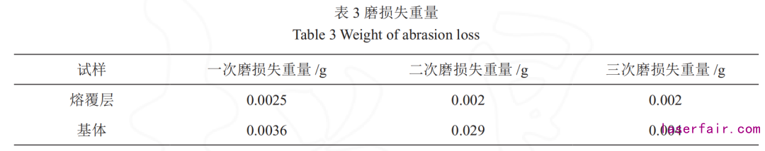 分別取基體和熔覆層試樣,經(jīng)清洗、干燥后分別稱取重量作為原始重量,使用 MMU-10G微機(jī)控制機(jī)高溫摩擦磨損試驗(yàn)機(jī)檢測(cè)耐磨性。與45鋼進(jìn)行對(duì)磨操作,對(duì)磨時(shí)間控制為1.5h,再次清洗、干燥后使用萬分之一電子天平稱取重量,作為磨損后重量,計(jì)算磨損失重量,重復(fù)進(jìn)行三次,得出的實(shí)驗(yàn)數(shù)據(jù)如表3。在三次對(duì)磨過程中,熔覆層試樣的磨損失重量均明顯低于基體試樣的磨損失重量,說明采用本技術(shù)方法進(jìn)行熔覆的缸體內(nèi)壁,其耐磨性能優(yōu)于立柱基體的耐磨性能,約為基體的 1.5 倍。