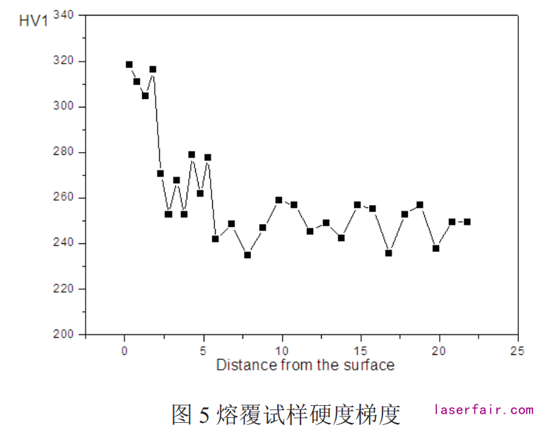 對(duì)內(nèi)孔熔覆試樣進(jìn)行機(jī)械加工,保留有效熔覆層厚度為0.5mm,取樣進(jìn)行剖面硬度檢測(cè),間隔 0.25mm 折線取檢測(cè)點(diǎn),硬度梯度曲線如圖 5 所示。由圖可以看出:在熔覆層厚度范圍內(nèi),平均硬度值為300-320HV1,結(jié)合界面周圍未現(xiàn)明顯起伏,基體平均硬度為230-300HV1,熔覆層和基體的硬度均較為穩(wěn)定,且熔覆層的硬度稍高于基體的硬度。這是因?yàn)镃r、Mo、Nb等元素為強(qiáng)碳化物形成元素,在熱量輸入足夠大的情況下有更多的碳化物得以生成;結(jié)合界面附近的顯微硬 度值略低于熔覆層的硬度,這可能是因?yàn)榛w對(duì)熔覆層具有一定的成分稀釋作用而且靠近基體的熔覆層會(huì)出現(xiàn)較為粗大的外延生長(zhǎng)樹枝晶所致,有效地提高缸體內(nèi)壁的耐磨損性,同時(shí),該硬度值有利于后續(xù)對(duì)缸體內(nèi)壁熔覆層進(jìn)行車削、磨削等機(jī)械加工操作。