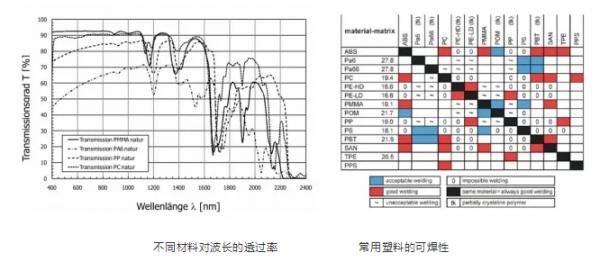 左圖是幾種透明塑料材料對波長的透過率,可以看出在塑料材料對1200nm以下波長的透過率都很高,對于1200nm以上波長吸收率有所增加。一般說來,當上層材料激光透過率高于50%,下層材料激光透過率低于20%時,會獲得較好的激光焊接效果。右邊這個圖表為常用塑料材料的可焊性。
