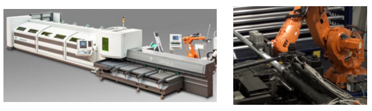 2. 完成彎管工序,并由機器人將管材放置在定位裝置上先定位,然后進(jìn)行激光切割彎管后的相關(guān)線和孔。如下圖所示。