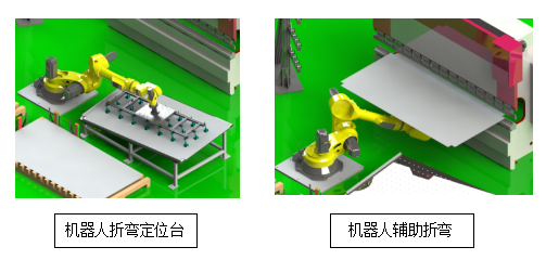 4. 第二個輔助折彎機器人將激光切割后的工件直接抓取出去完成折彎成型,不需要折彎的工件將由第一個機器人取下放置在一邊待處理
