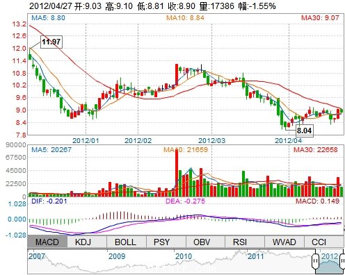 今 開: 9.03 成交量: 17385手 振 幅: 3.21% 最 高: 9.10 成交額: 1556.02萬 換手率: 0.90% 最 低: 8.81 總市值: 17.73億 市凈率: 3.68 昨 收: 9.04 流通市值...
