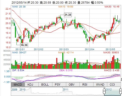 今 開(kāi): 20.30 成交量: 26784手 振 幅: 3.42% 最 高: 20.69 成交額: 5452.35萬(wàn) 換手率: 1.31% 最 低: 20.00 總市值: 60.42億 市凈率: 4.98 昨 收: 20.20 流通...