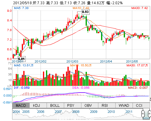 今 開: 7.33 成交量: 146211手 振 幅: 2.70% 最 高: 7.33 成交額: 10561.27萬 換手率: 1.55% 最 低: 7.13 總市值: 75.82億 市凈率: 2.55 昨 收: 7.41 流通市...