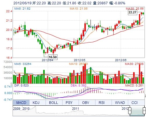 今 開: 22.20 成交量: 20867手 振 幅: 1.53% 最 高: 22.20 成交額: 4589.15萬 換手率: 1.02% 最 低: 21.86 總市值: 65.54億 市凈率: 5.40 昨 收: 22.21 流通...