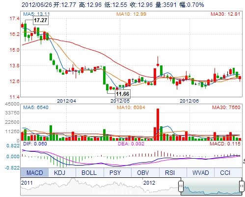 今 開(kāi): 12.77 成交量: 3591手 振 幅: 3.19% 最 高: 12.96 成交額: 457.82萬(wàn) 換手率: 1.86% 最 低: 12.55 總市值: 8.68億 市凈率: 2.79 昨 收: 12.87 流通市值...