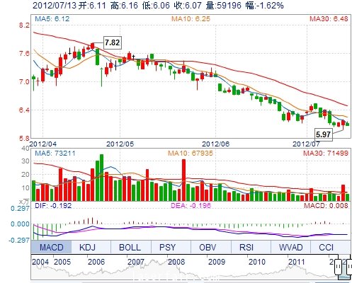 今 開: 6.11 成交量: 59195手 振 幅: 1.62% 最 高: 6.16 成交額: 3614.57萬(wàn) 換手率: 0.63% 最 低: 6.06 總市值: 63.39億 市凈率: 2.13 昨 收: 6.17 流通市值...