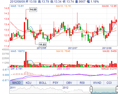 今 開: 13.58 成交量: 9666手 振 幅: 3.31% 最 高: 13.79 成交額: 1312.63萬 換手率: 2.90% 最 低: 13.34 總市值: 9.21億 市凈率: 2.95 昨 收: 13.58 流通市...
