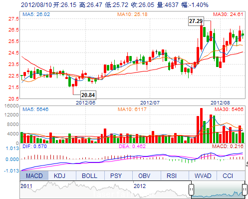 | 今 開: | 26.15 | 成交量: | 4636手 | 振 幅: | 2.84% |