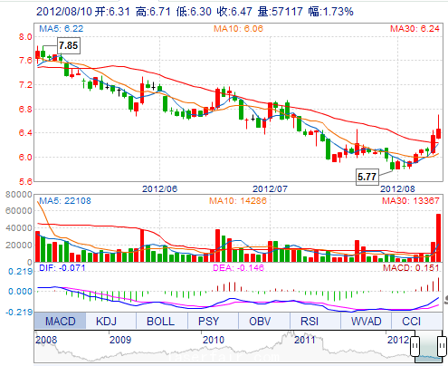 今 開: 6.31 成交量: 57116手 振 幅: 6.45% 最 高: 6.71 成交額: 3730.39萬 換手率: 2.08% 最 低: 6.30 總市值: 18.44億 市凈率: 2.95 昨 收: 6.36 流通市值...