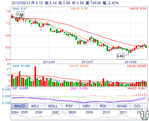 今 開(kāi): 6.12 成交量: 74638手 振 幅: 2.61% 最 高: 6.14 成交額: 4523.36萬(wàn) 換手率: 0.79% 最 低: 5.98 總市值: 62.45億 市凈率: 2.10 昨 收: 6.13 流通市值...