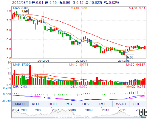 今 開: 6.01 成交量: 106150手 振 幅: 3.13% 最 高: 6.15 成交額: 6462.45萬 換手率: 1.12% 最 低: 5.96 總市值: 63.92億 市凈率: 2.15 昨 收: 6.07 流通市值...