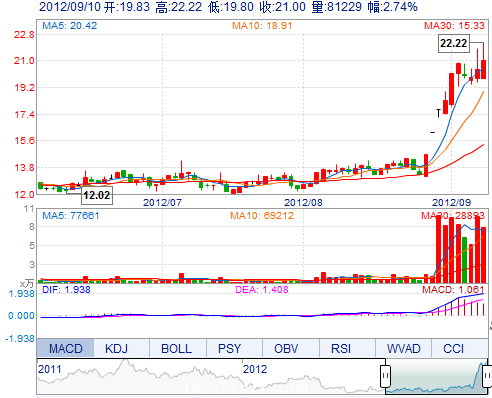 今 開: 19.83 成交量: 81228手 振 幅: 11.84% 最 高: 22.22 成交額: 16869.67萬 換手率: 24.39% 最 低: 19.80 總市值: 14.07億 市凈率: 4.52 昨 收: 20.44 流...