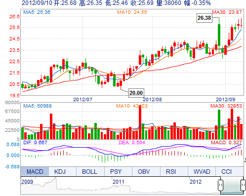 今 開: 25.68 成交量: 38059手 振 幅: 3.45% 最 高: 26.35 成交額: 9875.26萬 換手率: 2.08% 最 低: 25.46 總市值: 76.47億 市凈率: 6.02 昨 收: 25.78 流通...