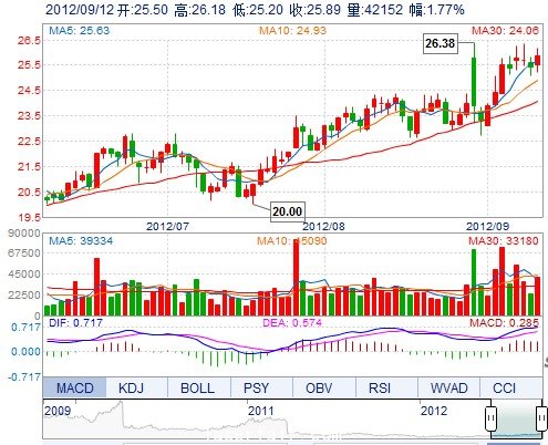 今 開: 25.50 成交量: 42151手 振 幅: 3.85% 最 高: 26.18 成交額: 10841.01萬 換手率: 2.31% 最 低: 25.20 總市值: 77.06億 市凈率: 6.06 昨 收: 25.44 流通...