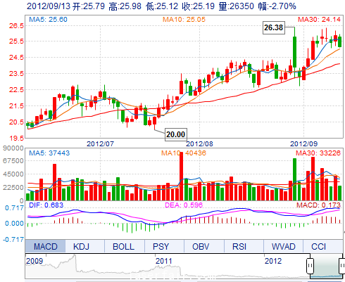 今 開(kāi): 25.79 成交量: 26349手 振 幅: 3.32% 最 高: 25.98 成交額: 6712.41萬(wàn) 換手率: 1.44% 最 低: 25.12 總市值: 74.98億 市凈率: 5.90 昨 收: 25.89 流通...