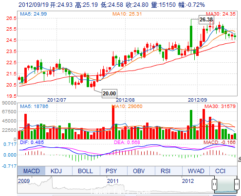 今 開: 24.93 成交量: 15149手 振 幅: 2.44% 最 高: 25.19 成交額: 3757.69萬 換手率: 0.83% 最 低: 24.58 總市值: 73.82億 市凈率: 5.81 昨 收: 24.98 流通...