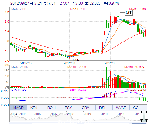 今 開: 7.21 成交量: 320173手 振 幅: 6.09% 最 高: 7.51 成交額: 23359.01萬 換手率: 3.38% 最 低: 7.07 總市值: 76.24億 市凈率: 2.71 昨 收: 7.23 流通市...