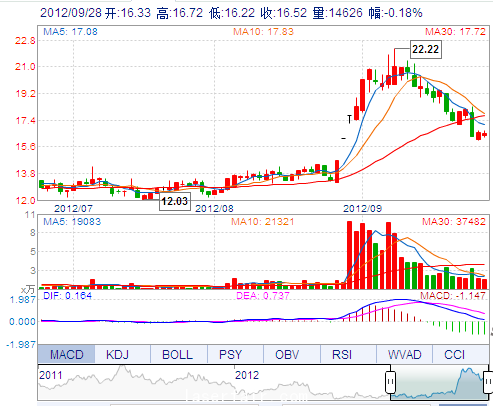 今 開: 16.33 成交量: 14625手 振 幅: 3.02%