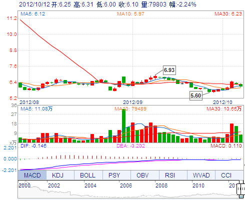 今 開(kāi): 6.25 成交量: 79802手 振 幅: 4.97% 最 高: 6.31 成交額: 4901.44萬(wàn) 換手率: 0.90% 最 低: 6.00 總市值: 54.36億 市凈率: 1.05 昨 收: 6.24 流通市值...