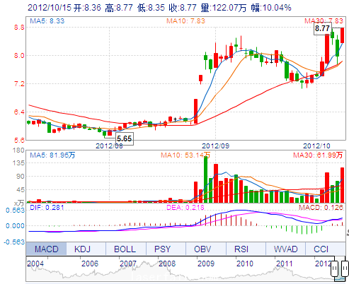今 開: 8.36 成交量: 1220698手 振 幅: 5.27% 最 高: 8.77 成交額: 105669.15萬 換手率: 12.90% 最 低: 8.35 總市值: 91.59億 市凈率: 3.26 昨 收: 7.97 流通...