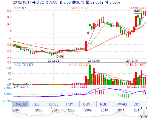 今 開: 8.72 成交量: 590514手 振 幅: 4.84% 最 高: 9.00 成交額: 51907.15萬(wàn) 換手率: 6.24% 最 低: 8.58 總市值: 91.18億 市凈率: 3.25 昨 收: 8.68 流通市...
