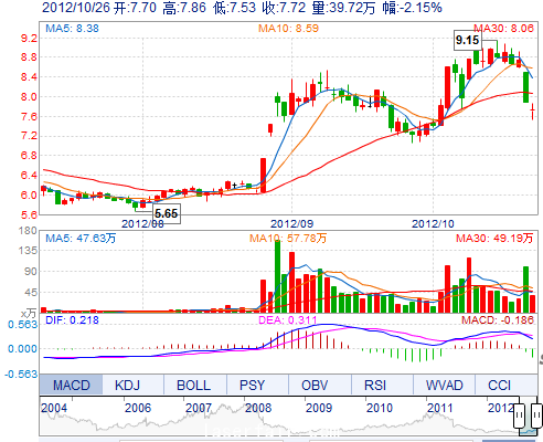 今 開: 7.70 成交量: 397157手 振 幅: 4.18% 最 高: 7.86 成交額: 30583.50萬 換手率: 4.20% 最 低: 7.53 總市值: 80.63億 市凈率: 2.49 昨 收: 7.89 流通市...
