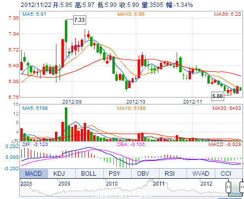 今 開: 5.95 成交量: 3505手 振 幅: 1.17% 最 高: 5.97 成交額: 207.78萬 換手率: 0.13% 最 低: 5.90 總市值: 16.82億 市凈率: 2.74 昨 收: 5.98 流通市值: ...