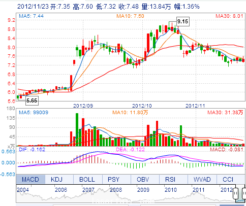 今 開: 7.35 成交量: 138368手 振 幅: 3.79% 最 高: 7.60 成交額: 10372.87萬 換手率: 1.46% 最 低: 7.32 總市值: 78.12億 市凈率: 2.41 昨 收: 7.38 流通市...