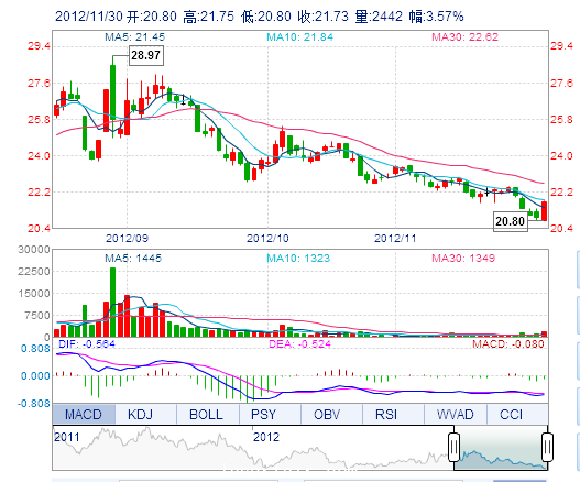 今 開: 20.80 成交量: 2442手 振 幅: 4.53% 最 高: 21.75 成交額: 522.12萬元 換手率: 2.33% 最 低: 20.80 總市值: 7.61億 市凈率: 2.65 昨 收: 20.98 流通市...