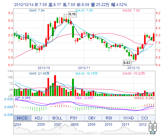 今 開(kāi): 7.69 成交量: 25.22萬(wàn)手 振 幅: 6.20% 最 高: 8.17 成交額: 2.03億元 換手率: 2.67% 最 低: 7.69 總市值: 84.49億 市凈率: 2.61 昨 收: 7.74 流通市值...