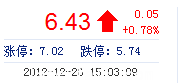 今 開: 6.34 成交量: 19.07萬手 振 幅: 4.23% 最 高: 6.60 成交額: 1.23億元 換手率: 4.37% 最 低: 6.33 總市值: 28.09億 市凈率: 2.09 昨 收: 6.38 流通市值...