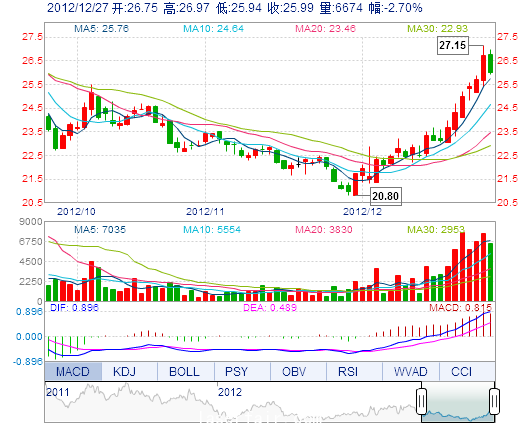 今 開: 26.75 成交量: 6674手 振 幅: 3.86% 最 高: 26.97 成交額: 1751.67萬元 換手率: 6.37% 最 低: 25.94 總市值: 9.10億 市凈率: 3.17 昨 收: 26.71 流通...