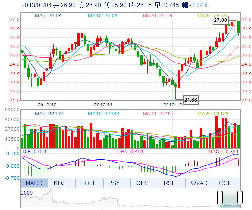 今 開(kāi): 26.90 成交量: 3.37萬(wàn)手 振 幅: 3.71% 最 高: 26.90 成交額: 8834.03萬(wàn)元 換手率: 1.80% 最 低: 25.90 總市值: 77.84億 市凈率: 5.97 昨 收: 26.97 流...