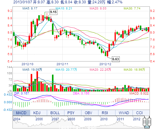 今 開: 8.07 成交量: 24.29萬手 振 幅: 3.21% 最 高: 8.30 成交額: 1.99億元 換手率: 2.57% 最 低: 8.04 總市值: 86.68億 市凈率: 2.68 昨 收: 8.10 流通市值...
