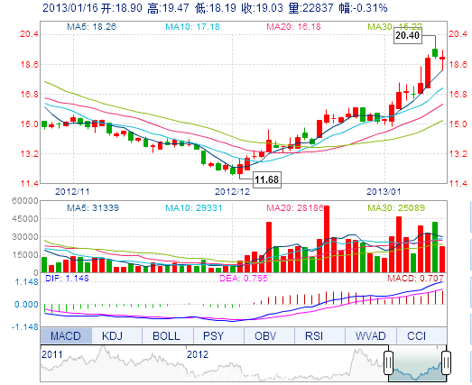 | 最 高: | 19.47 | 成交額: | 4305.10萬(wàn)元 | 換手率: | 6.83% |