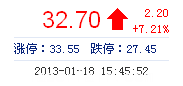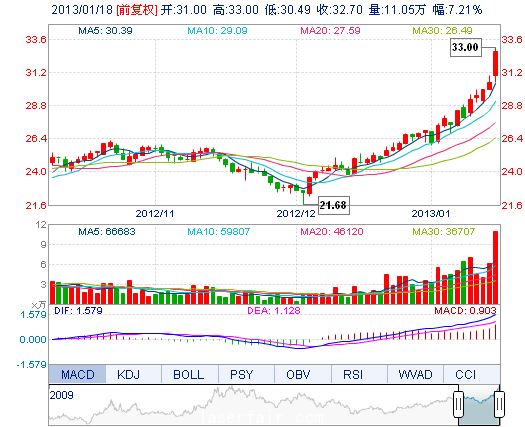 今開: 31.00 成交量: 11.05萬(wàn)手 振幅: 8.23% 最高: 33.00 成交額: 3.50億元 換手率: 4.01% 最低: 30.49 總市值: 97.33億 市凈率: 7.47 昨收: 30.50 流通市值...