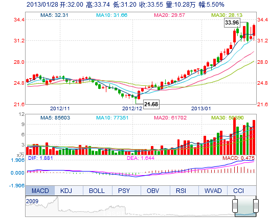 今開: 32.00 成交量: 10.28萬手 振幅: 7.99% 最高: 33.74 成交額: 3.33億元 換手率: 3.73% 最低: 31.20 總市值: 99.86億 市凈率: 7.66 昨收: 31.80 流通市值...