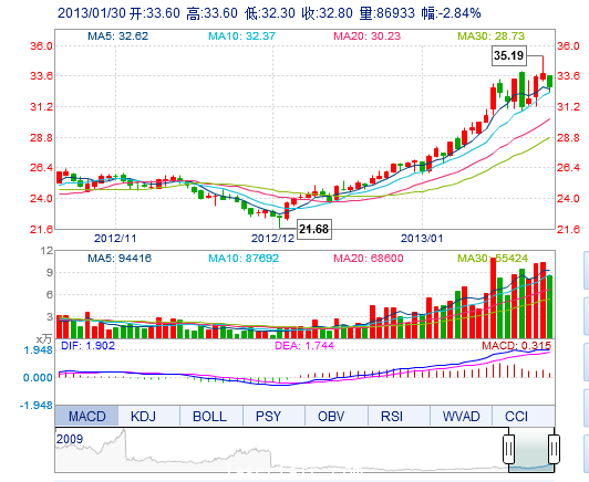 | 最 高: | 33.60 | 成交額: | 2.85億元 | 換手率: | 3.15% |