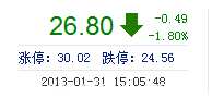 今開: 27.55 成交量: 3180手 振幅: 3.11% 最高: 27.56 成交額: 855.71萬元 換手率: 3.04% 最低: 26.71 總市值: 9.38億 市凈率: 3.27 昨收: 27.29 流通市值: ...